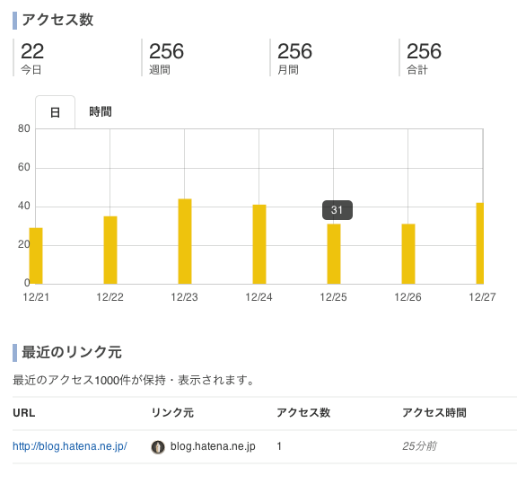 アクセス数は「日別」と「時間別」の2種類が記録・表示されます。リンク元は最近のアクセス1000件が保持・表示されます。なお、アクセス数の種類やリンク元の件数などは暫定的な仕様で、将来的に変更する可能性があります。変更は、このはてなブログ開発ブログにてお知らせします。