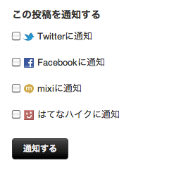 設定が終わると、記事投稿後の画面で、各ソーシャルメディアのチェックボックスが有効になります。通知したいソーシャルメディアを選んで「通知する」ボタンをクリックすると、ブログを書いたことを通知できます。