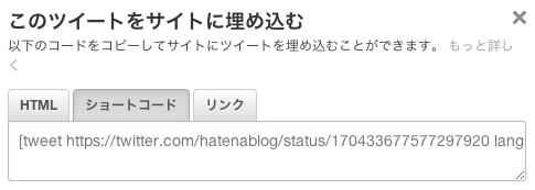 Twitterの個別ツイートのページに表示されている「このツイートをサイトに埋め込む」メニューから「ショートコード」をコピーしてブログに貼ると、ツイートをブログの記事内に埋め込むことができます。
